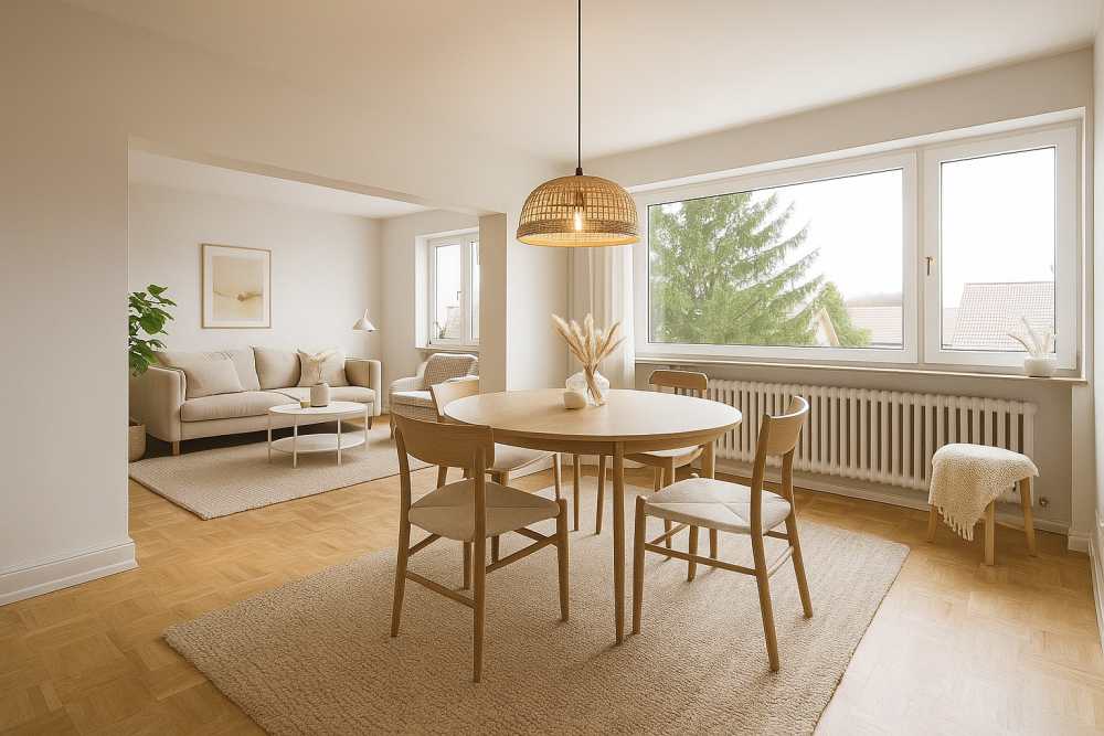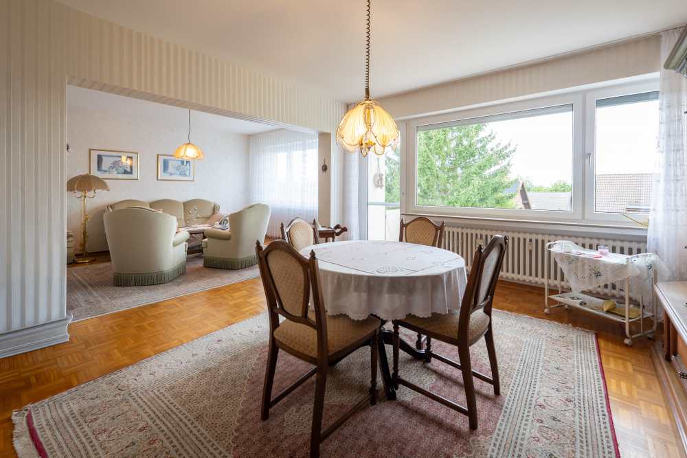 Der großzügige Wohn-Essbereich, sowie die Diele ist mit einem Stäbchenparkett ausgestattet und bietet Zugang auf den Balkon mit Markise.