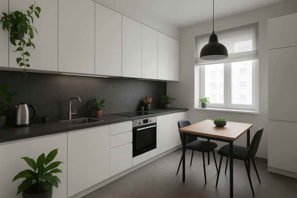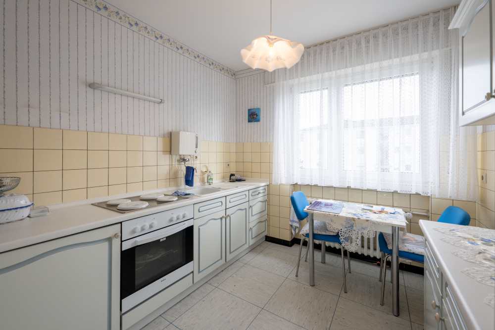Die Küche verfügt über einen kleinen Abstellraum und bietet ausreichend Platz für einen kleinen Tisch.