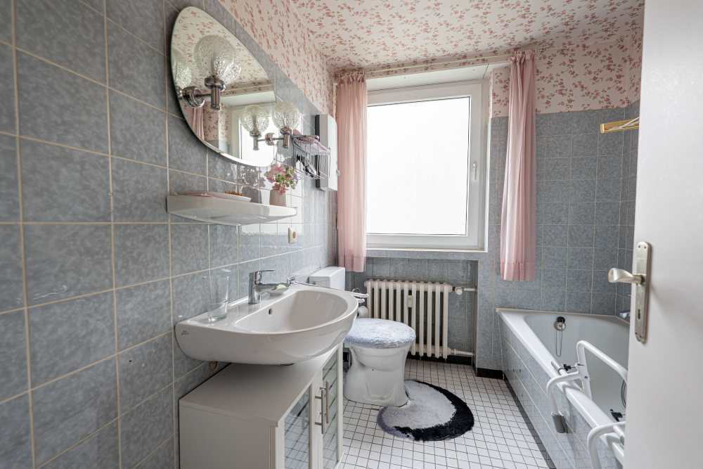 Das Tageslichtbadezimmer ist etwas in die Jahre gekommen und ist aktuell mit einer Badewanne ausgestattet.