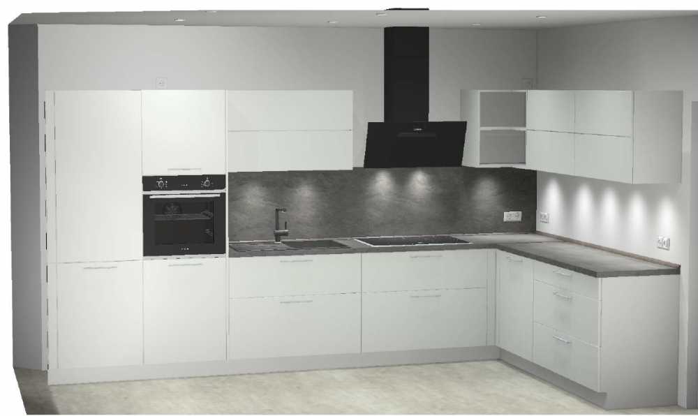 Nolte-Einbauküche mit Siemens-Geräten, Dunstabzug über Außenwand